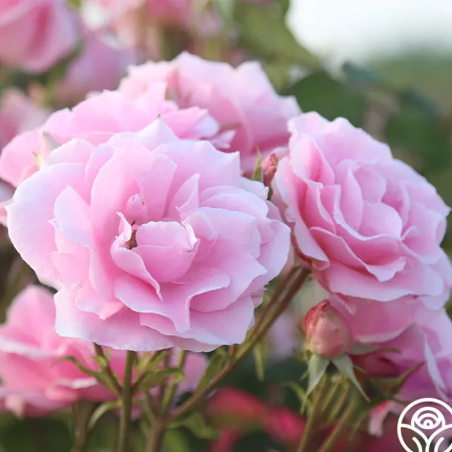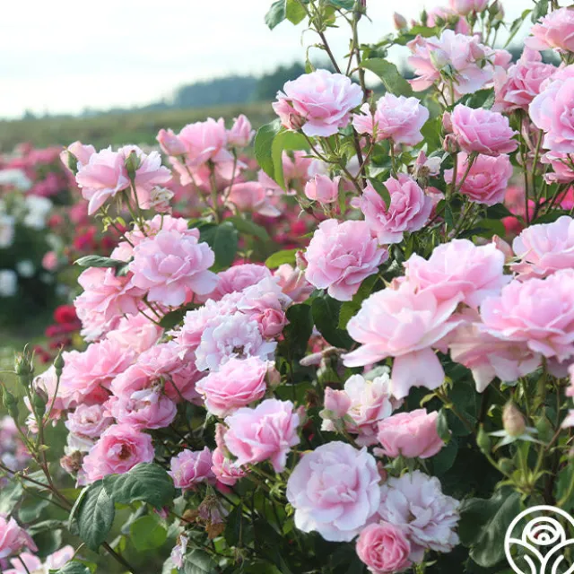- A shrub rose with pointed buds that open into lovely soft pink, double blooms that are at times blushed with soft apricot and white at the base of the petals. The flowers are profusely borne in clusters of 5-10 and are sweetly scented. Large dark green leathery foliage provides a perfect backdrop for the bloom. An upright bushy plant, this friend is winter hardy in the midwest without protection.