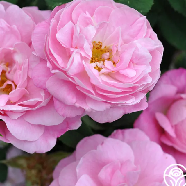 A unique color among old roses with its delicate shade of coral pink. Its slightly cupped, semi-double flowers with golden yellow stamens are borne in clusters on a vigorous, upright bush. The flowers have an exceedingly strong myrrh fragrance. A very old variety found growing in a convent in France.