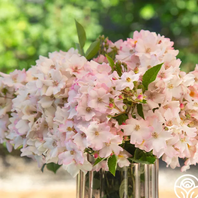 A delicate but prolific Polyantha bred by John Bagnasco, Blushing Dogwood produces clusters of 15–25 blooms per stem. Her 5-petaled pink blooms fade to a creamy white with streaks of pink in a starburst pattern, set against shiny green foliage with laciniated edges. A fast grower needing minimal care, she offers a pop of joy wherever placed in the garden.