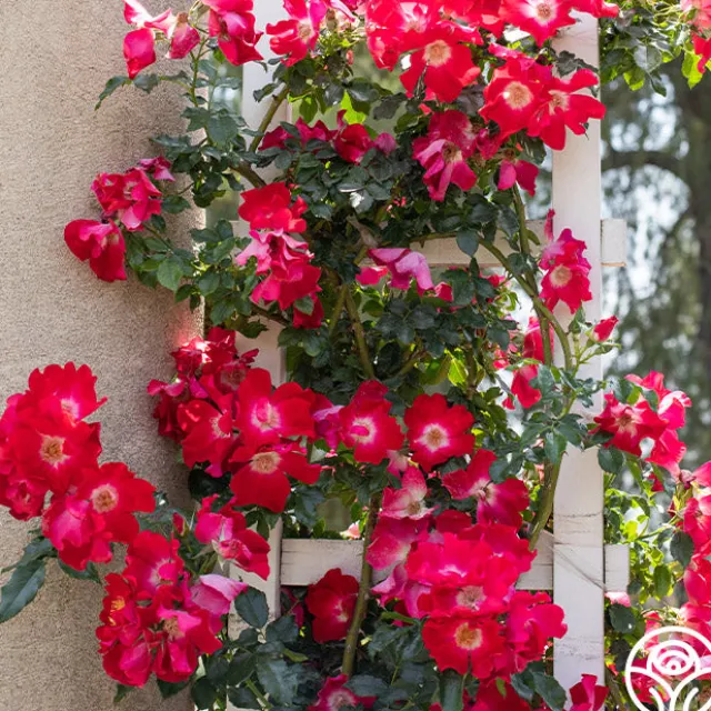 Dortmund® is a bright red rose with a white eye and ruffled, 3 1/2″ blooms on a repeat blooming Climber with extra dark, holly-like foliage. This rose will reach up to 12’ tall as her clustered blooms reach for sunlight. Dortmund®’s flowers are followed by attractive, orange hips making her a beauty in multiple seasons.