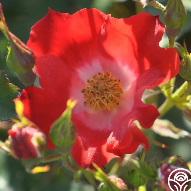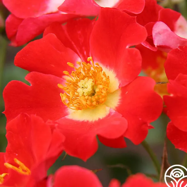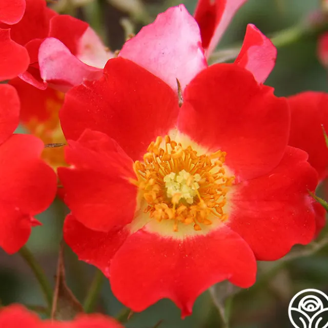 Delicate, single, vermilion to red flowers cover this compact growing Floribunda while showing off beautiful white centers and bright yellow stamens. Eyepaint® is a prolific producer of 2.5” flowers that emit a gentle fragrance and will bloom in flushes. She can be planted in a container, as a hedge, in raised beds, gardens, and landscapes, and makes a great cut flower.