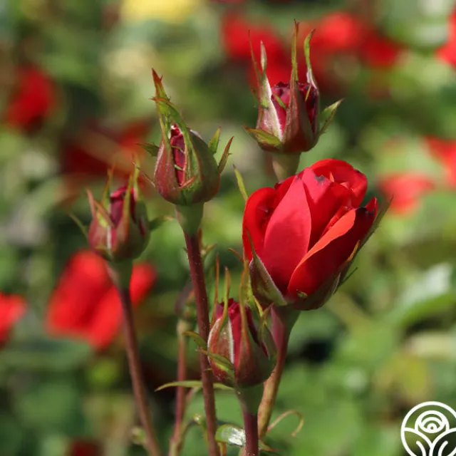Bred in France in the 1950s, this Floribunda produces small clusters of 2” blooms in flushes throughout the season. Like his name suggests, Fire King is a scarlet almost geranium-red rose that stands out against its dark, leathery foliage. He has a strong, musky fragrance that emits from double blooms.
