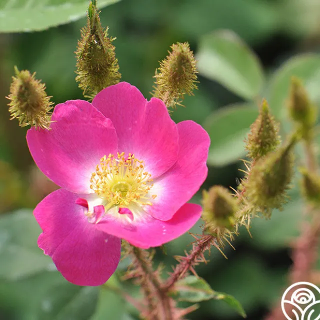 Goethe is a favorite of pollinators producing flowers of very dark crimson to magenta with prominent yellow stamens. His blooms are single to semi-double, open, with a moderate fragrance. Expect numerous prickles with very vigorous growth for this single-blooming rose. Goethe thrives best in zones 5-10.