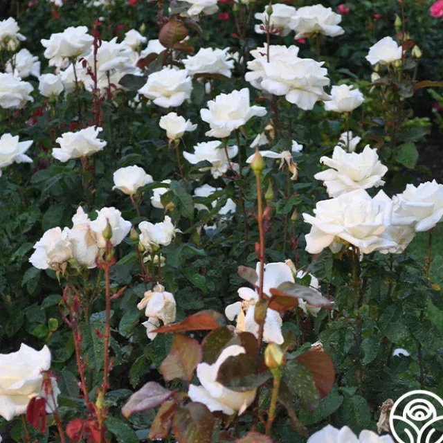 Honor™ produces huge, well-formed clear white blooms on tall, vigorous stems with the gentlest touch of cream. Her large, dark green leaves and bronzy-red new growth are very disease resistant. A favorite of the bees, give Honor 2-3 ft to spread out and watch her take off to up to 6 ft tall. She makes an excellent cut rose.