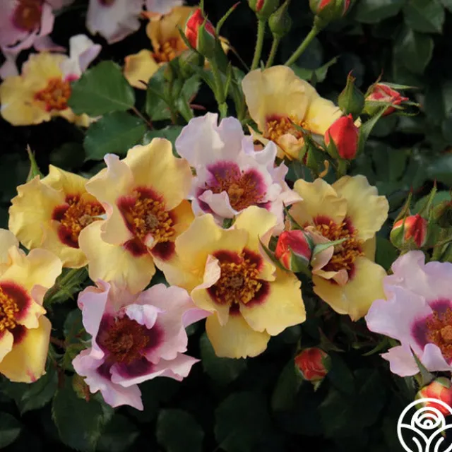 A true, show-stopping variety, In Your Eyes™ packs a punch with her unique coloring and elegant, growth habit. Starting as a creamy yellow with an intense red center, she will fade to a soft lavender as she ages. Her single blooms come out in clusters for a showy display throughout the season. In Your Eyes™ is wildly prolific and has strong disease resistance in addition to a mild, fruity fragrance.