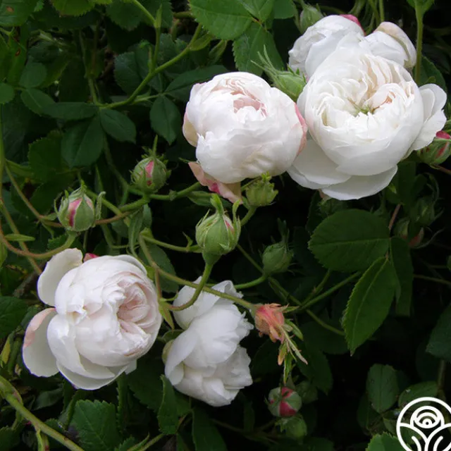 This variety is a hybrid alba (crosse with a noisette). An outstandingly fragrant, fully double, medium size pompon blooms of rich, creamy white. Borne in great profusion early in the season. A large graceful arching bush that may be trained as a climber. Not for the small garden but wonderful if you have the room. Once blooming.