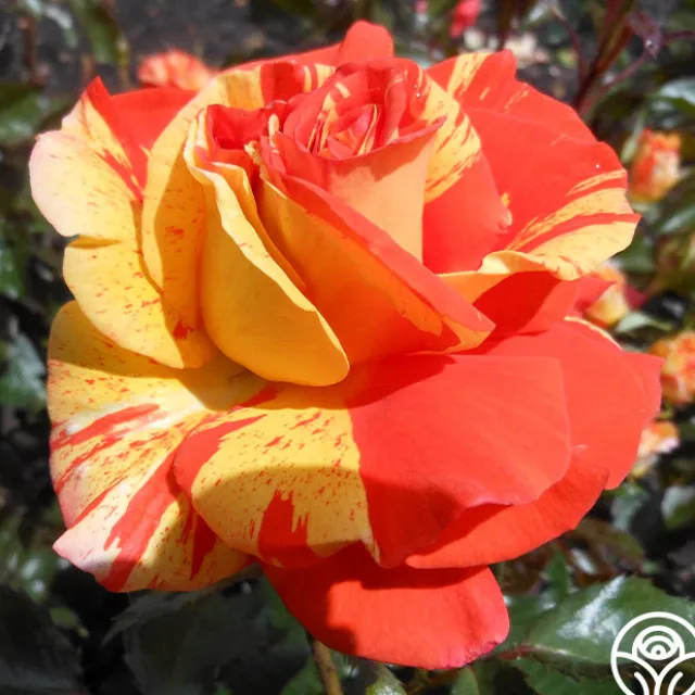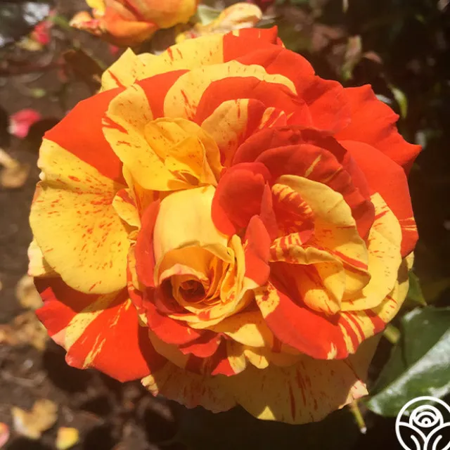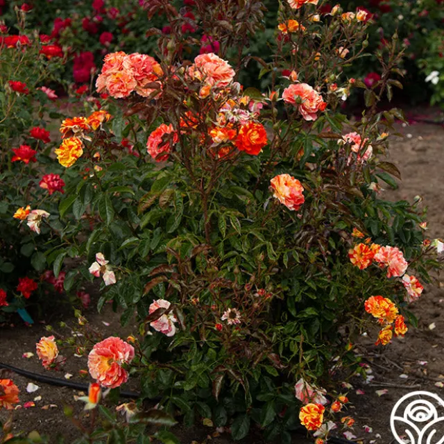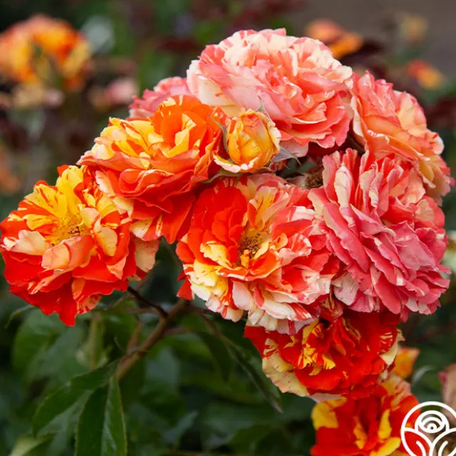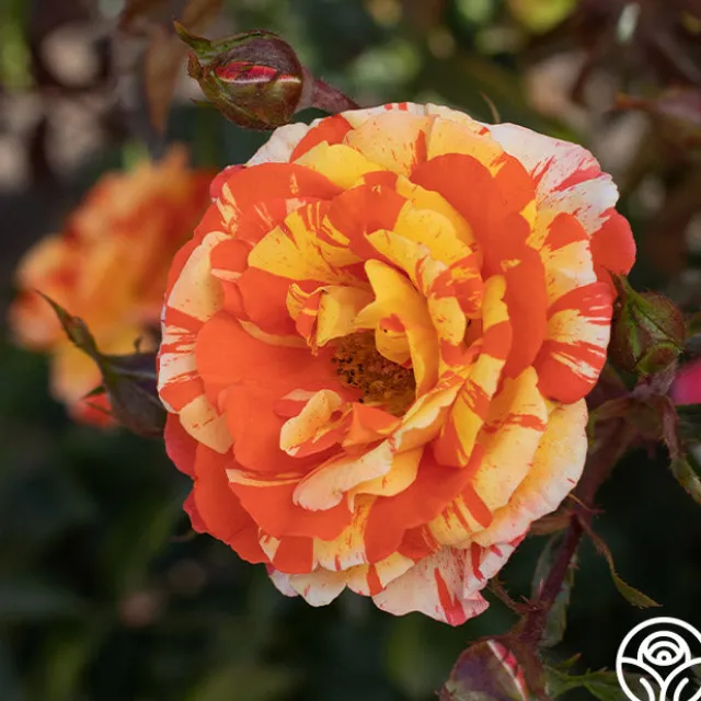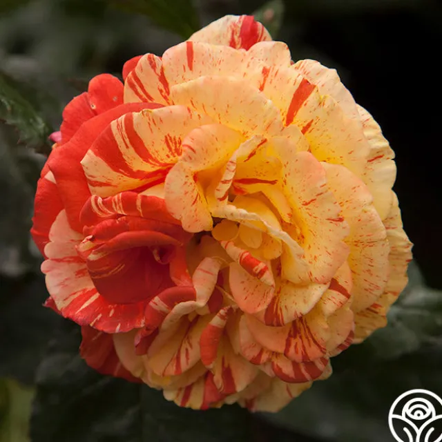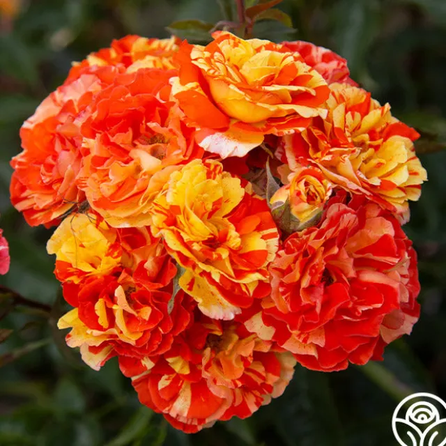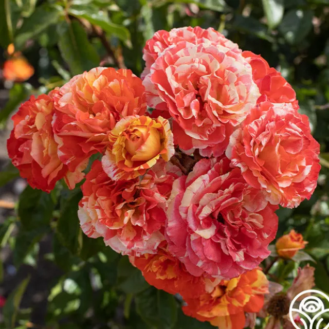 Medium to large, fully double, 4” blooms with 30+ petals are produced in clusters on Oranges ‘n’ Lemons. Her flowers are striped, speckled, and streaked with peachy cream coloring that fades gently as she ages. Her roses have a mild fruity fragrance and a delightfully unique coloring.