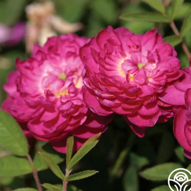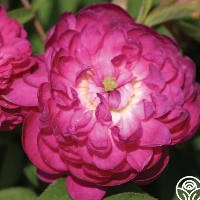 Outstanding in our garden and greatly admired by visitors. Small pompon type 1 1/2″ blooms of pale pink to purple erupt in profusion on a densely foliaged, compact once blooming plant with small foliage. One of the first to bloom in our garden. The blooms spread over the entire bush which itself is of great interest even without blooms. Would be an excellent plant for a small hedge or border, or lovely by the front door or path. Very even growth. Lower canes are never visible. Good for small gardens and tubs.
