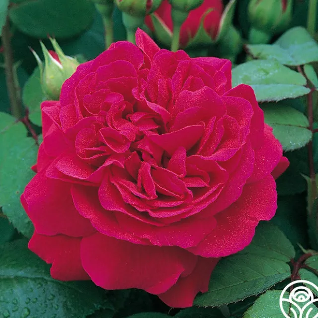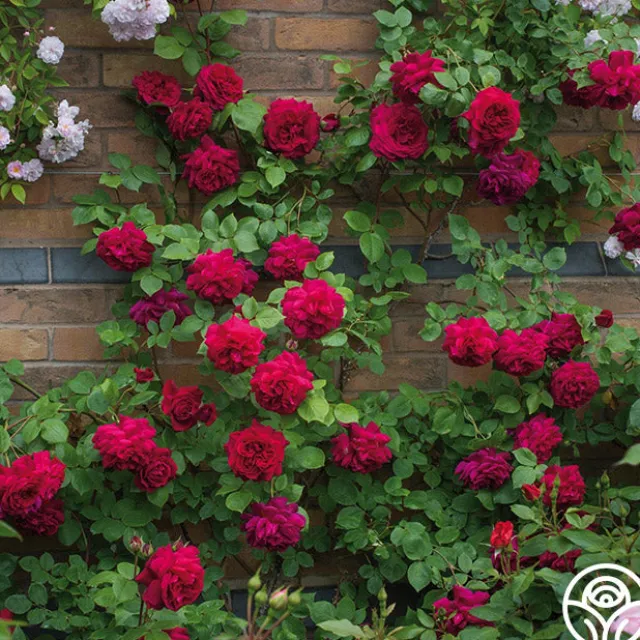 Named for the Thomas Hardy novel, Tess of the d’Urbervilles® features large, fragrant, 4″ flowers with 70+ petals in a bright crimson color. Her blooms have a nice, deeply curved shape in the early stages, and then her petals turn back to a less formal flower. Tess of the d’Urbervilles®’ blooms are hefty and usually bend over, giving an elegant, cascading effect to the bush. Her growth is robust and spreads against large, dark green foliage. We love Tess of the d’Urbervilles®’ old rose and fruity-myrrh fragrance and that she is a generous, repeat bloomer. She can makes an excellent Climber and be grown in a large container.