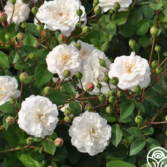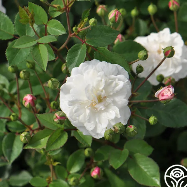 PERFECT IN POTS! White Pet is a compact, extremely double rose with pom pom blooms of pure white. She is an abundant repeat bloomer and delicately fragrant. Outstanding! White Pet is great for pots and in the front of the border where she can easily be seen.