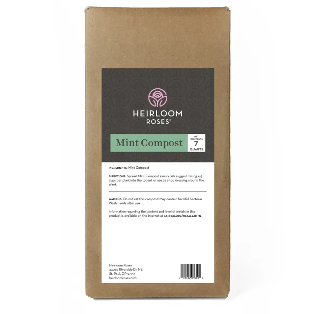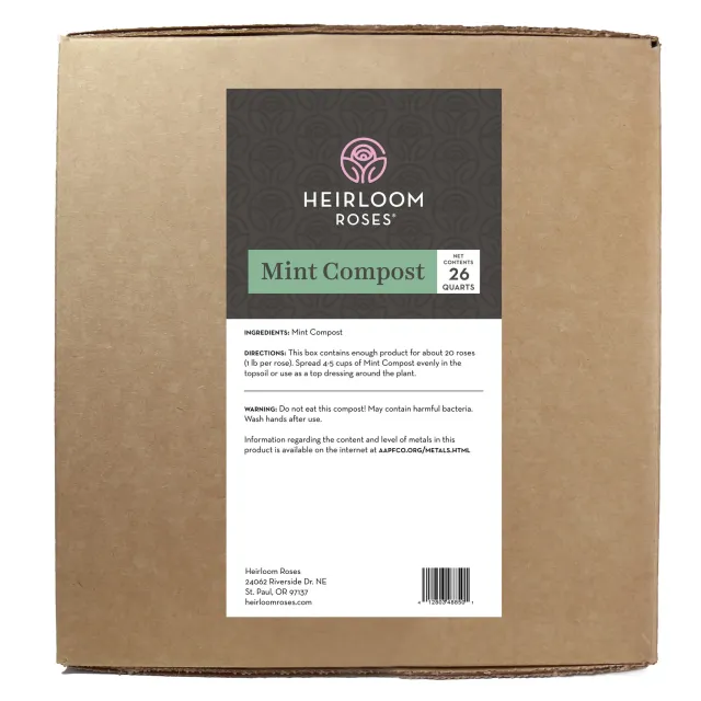 Mint Compost is exceptional at providing moisture retention in sandy, dry soils, while also rich in natural humus to help break up hard clay soils. Mint Compost may also be used as a mulch top dressing around shrubs and in other garden areas. When applied to roses, Mint Compost is a natural agent that helps to repel aphids, spider mites, and other damaging insects. Spread the compost evenly. We suggest mixing one 1.5 quart bag per plant in the topsoil or using as a top dressing around the plant. The 7 quart box is enough for five roses, or as using as a top dressing in containers or around the plant. The 26 quart box is enough for 20 roses or using as a top dressing in your garden. We recommend reapplying this product every 6 months.