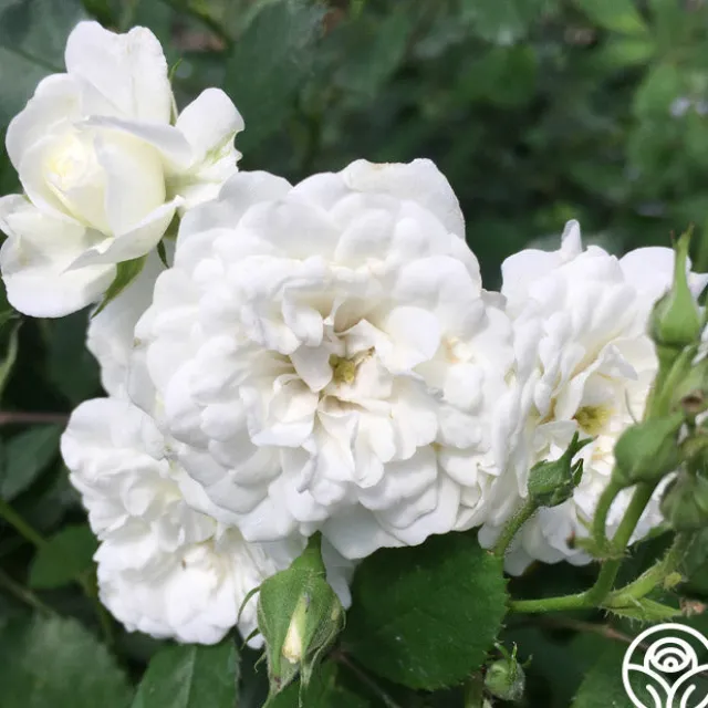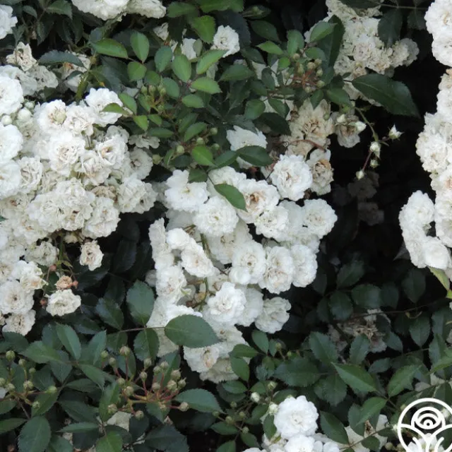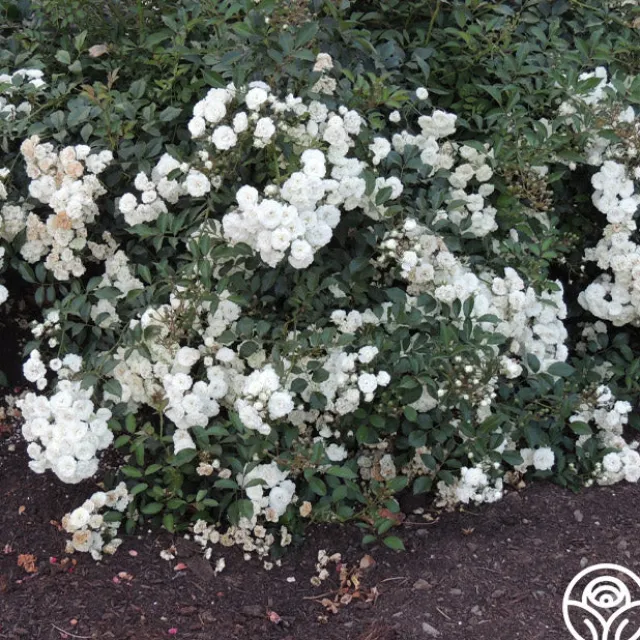 Alba Meidiland® shows off with profuse, large clusters of very double, pure white, 1 ½” blooms with 40+ petals each. To make the gardener’s life easier, she even drops her old petals so that no deadheading is necessary. This spreading plant is covered in dark, glossy foliage that shows off the pure white blooms to perfection.