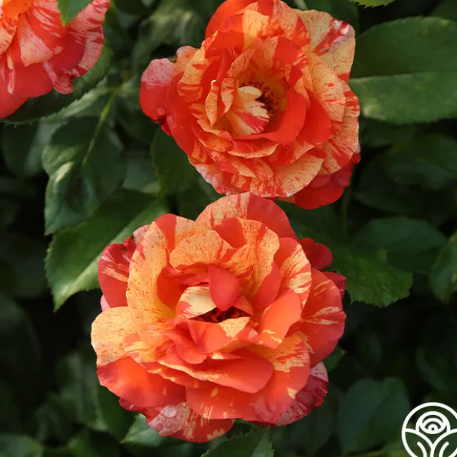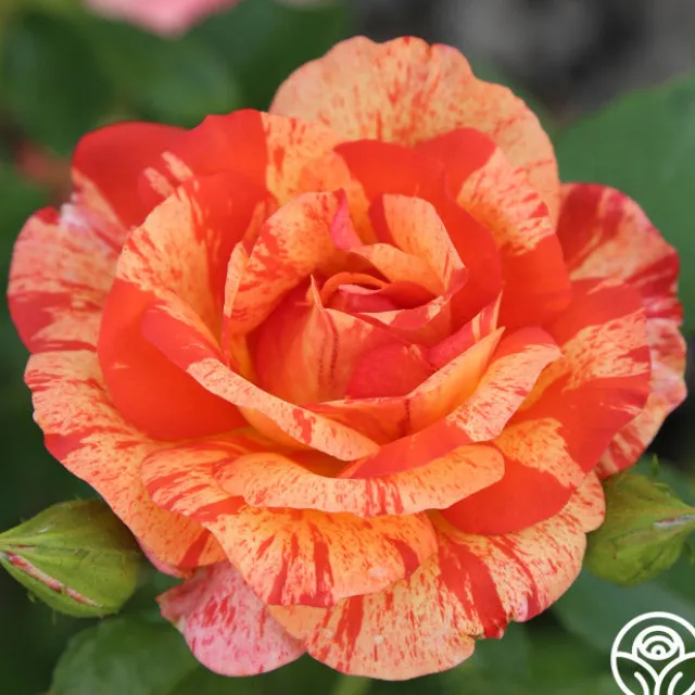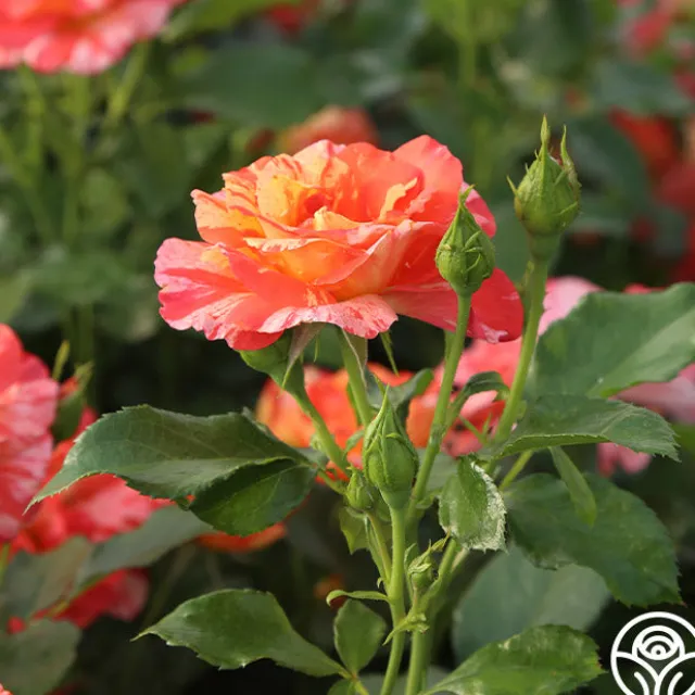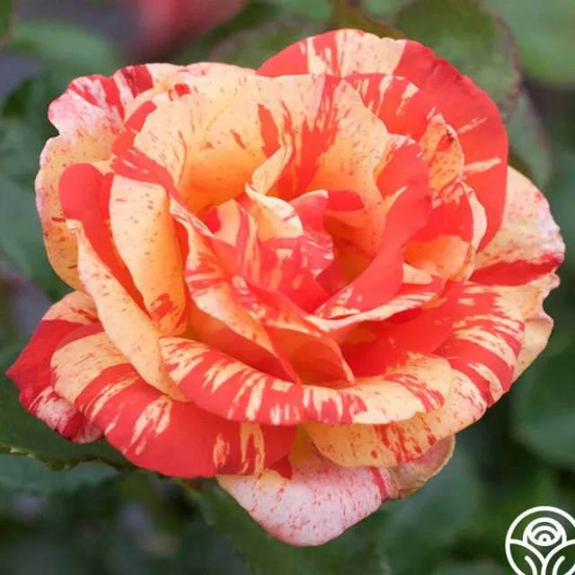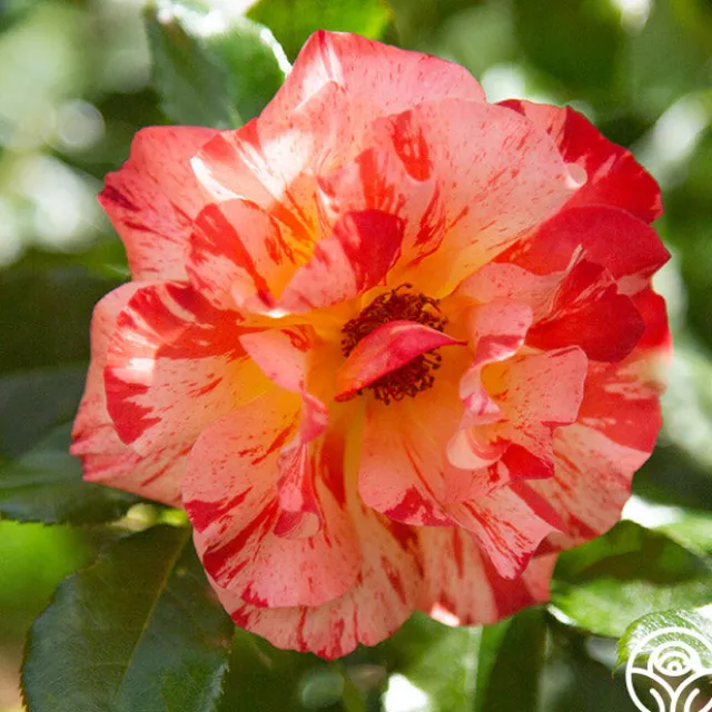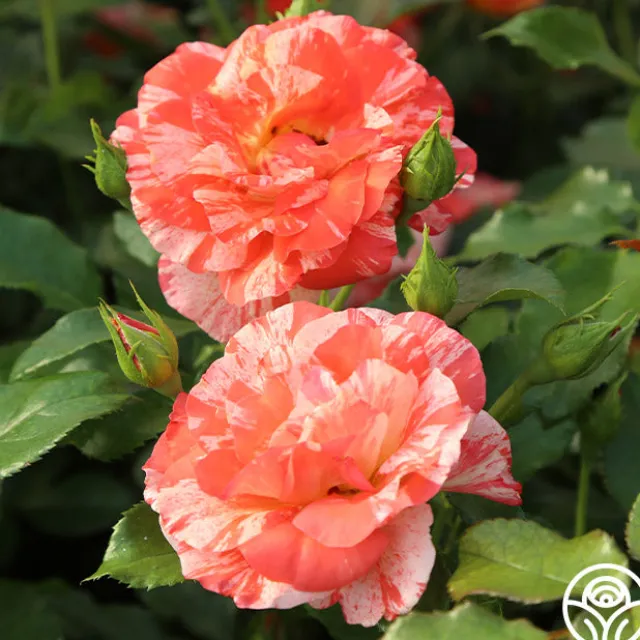 Prepare to be captivated by the striking beauty of Alfred Sisley. Named for the Impressionist landscape painter who was born and spent most of his life in France, Alfred Sisley displays an abundance of glorious burnt salmon/orange flowers splashed with stripes of creamy white. The generous production of large, frilly, and semi-double blooms make a colorful display. Alfred Sisley is a robust and bushy 3′ rose plant that handles the heat well.