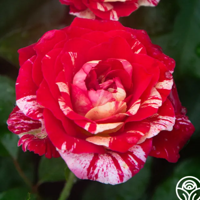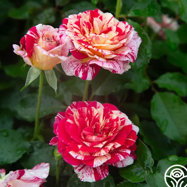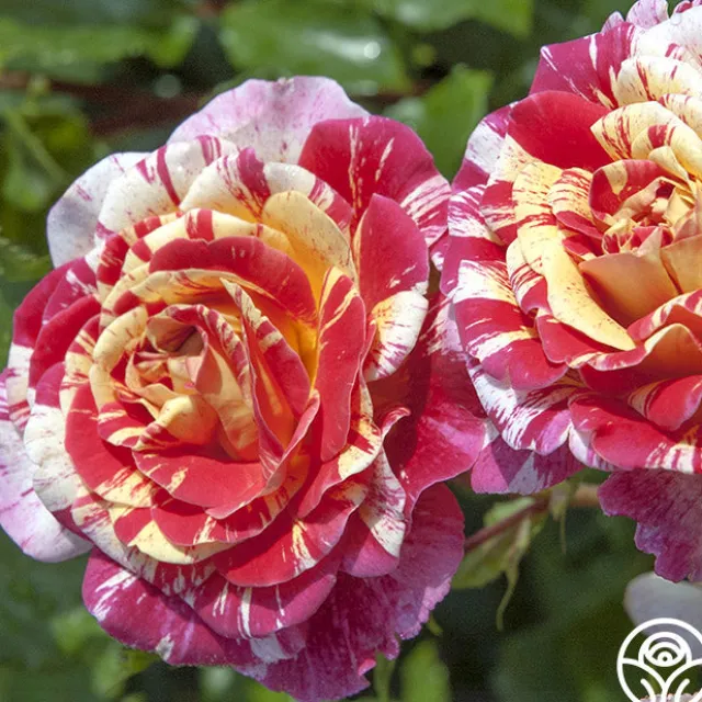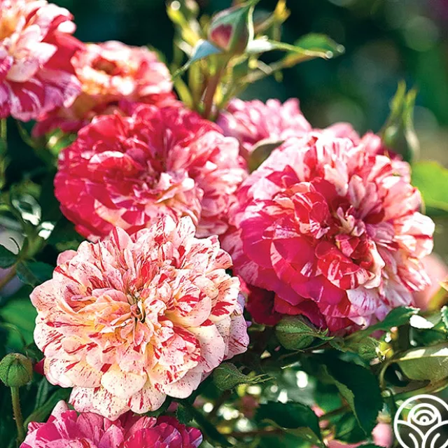 Splattered with a color explosion of red, pink, and yellow, All-American Magic™ is one of the hardiest and disease-resistant striped roses. She has a mild raspberry fragrance and blooms in flushes throughout the season, growing to about 4-5’ in height. With up to 60 petals per flower and randomly distributed coloring, no two blooms are ever alike! She truly is a gem for the rose garden.