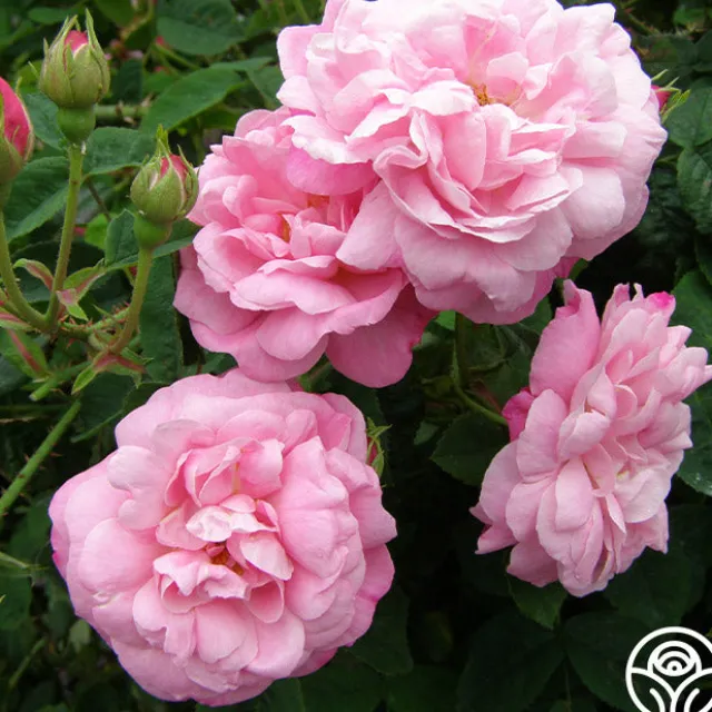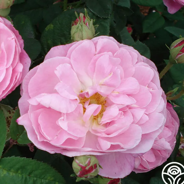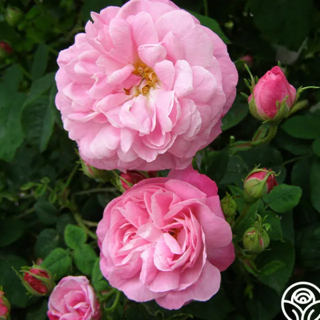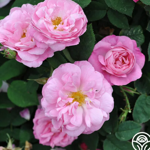 A unique color among old roses with its delicate shade of coral pink. Its slightly cupped, semi-double flowers with golden yellow stamens are borne in clusters on a vigorous, upright bush. The flowers have an exceedingly strong myrrh fragrance. A very old variety found growing in a convent in France.