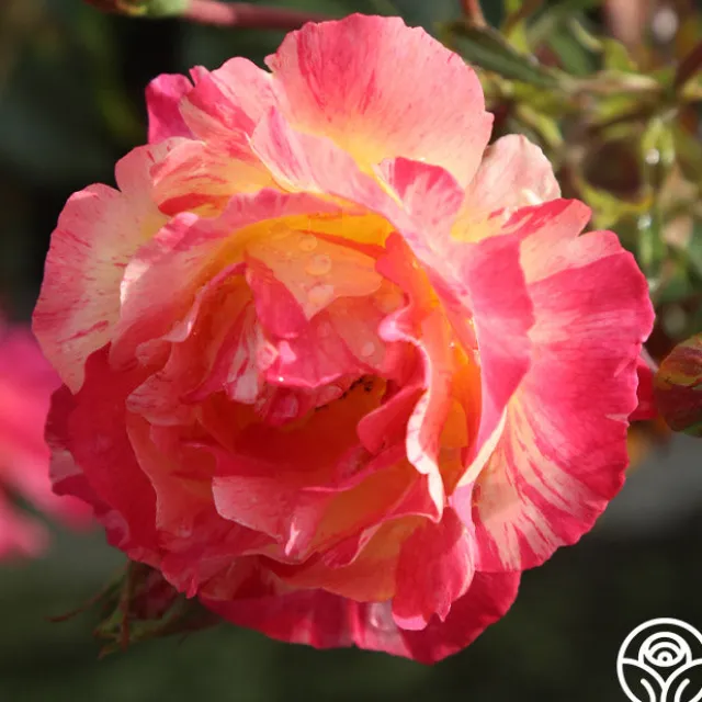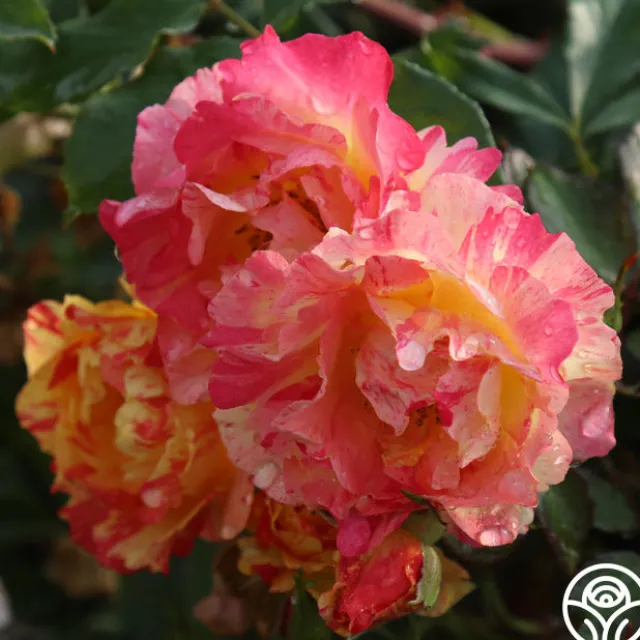 Bring a tropical paradise to your garden with Citrus Splash™. Her festive orange and yellow striped, double blooms fade to yellow and pink as they mature while exuding a delightful, sweet fruit fragrance. This Floribunda has an elegant, upright growth habit with glossy, dark green foliage that will make an excellent addition to your beds, borders, and hedges.