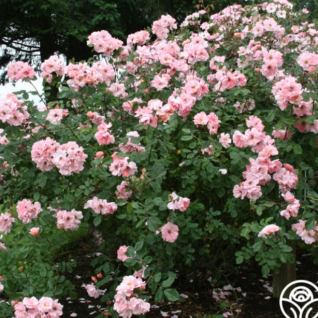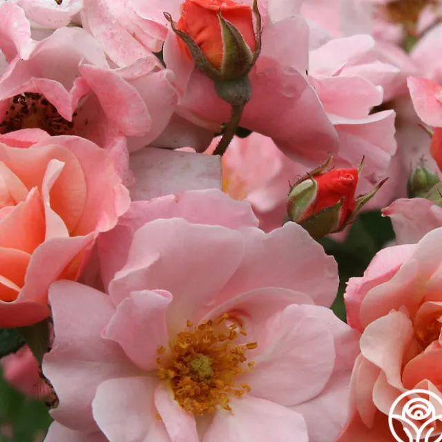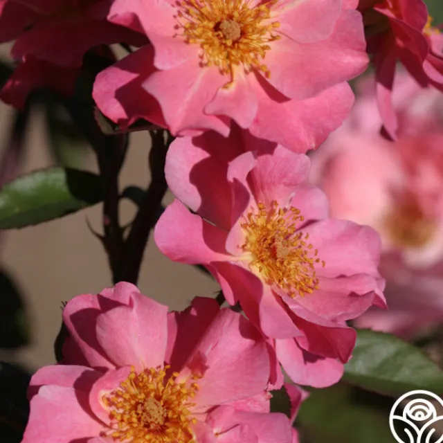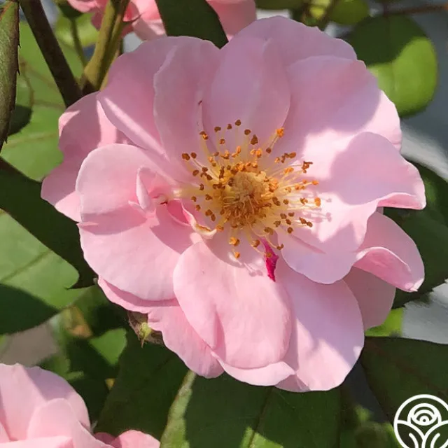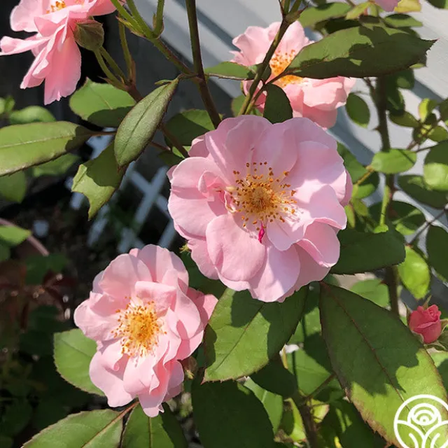 Clair Matin® is an outstanding repeat blooming rose. Her large clusters of exquisite, semi-double, 5” blooms are a clear, soft pink with deeper highlights and feature a very large center of the most beautiful golden stamens. She is nicely fragrant and one of the most free-flowering roses.