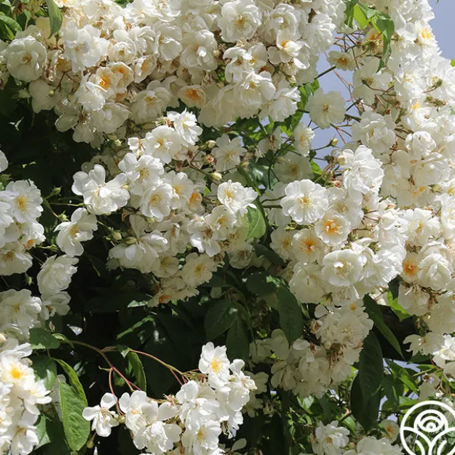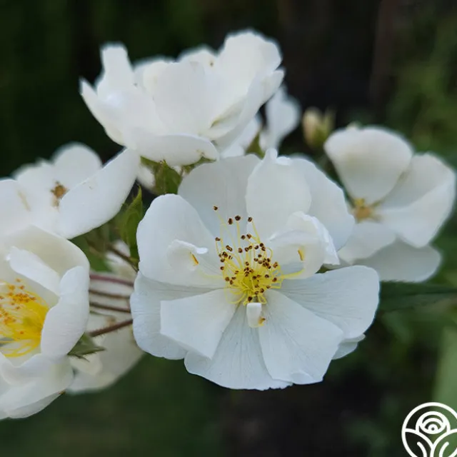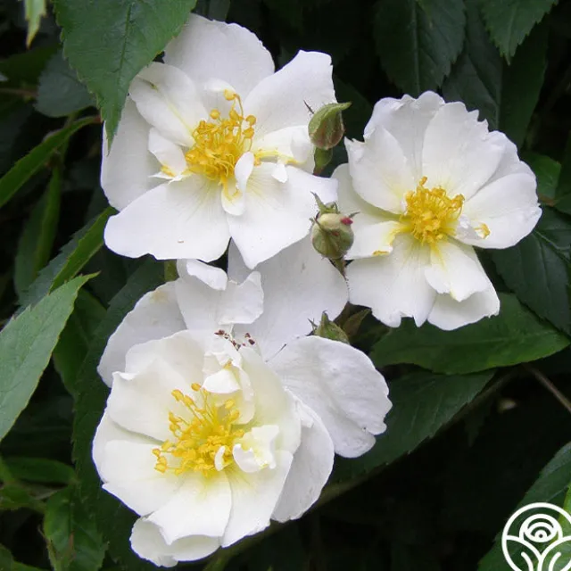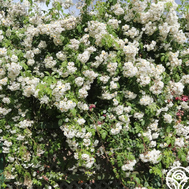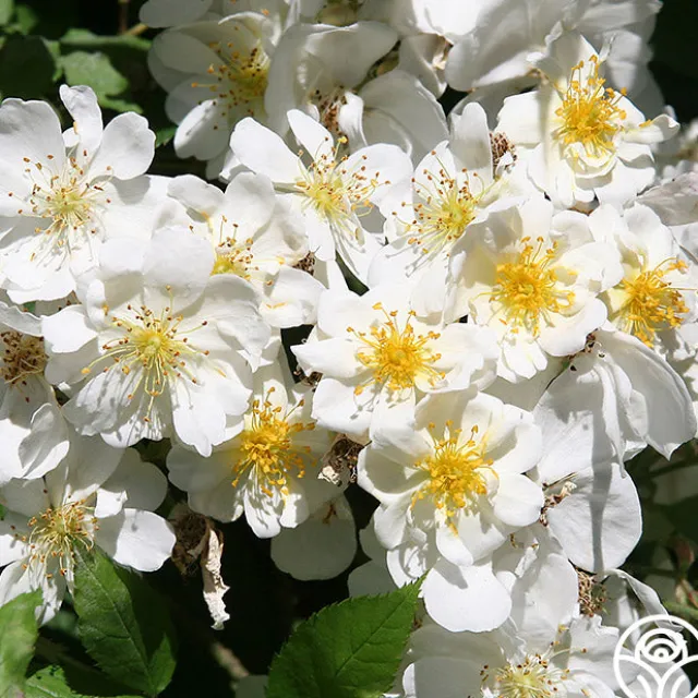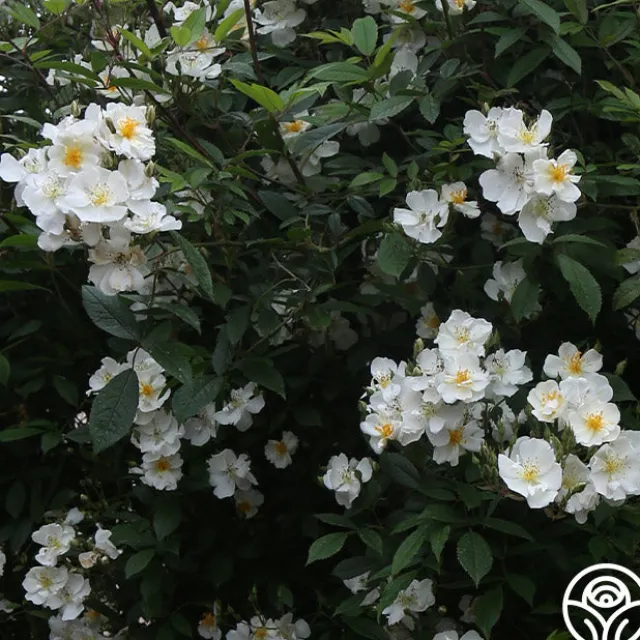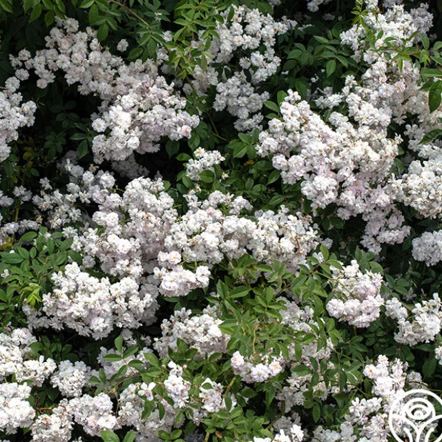 TOP SELLING RAMBLER! It’s easy to see why Darlow’s Enigma is a “must-have” for Rambler lovers. His pure white, semi-double, 1 ½” blooms with 5-8 petals open flat to show golden centers that are a favorite of pollinators. His blossoms are produced in clusters on a continually blooming bush. Darlow’s Enigma also is shade tolerant, extremely fragrant, produces beautiful hips, and thrives all the way down to zone 4. What’s not to love?