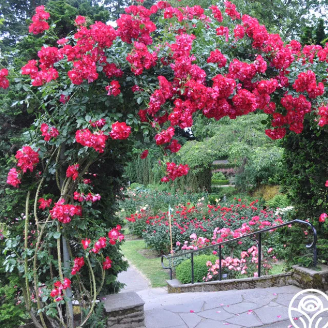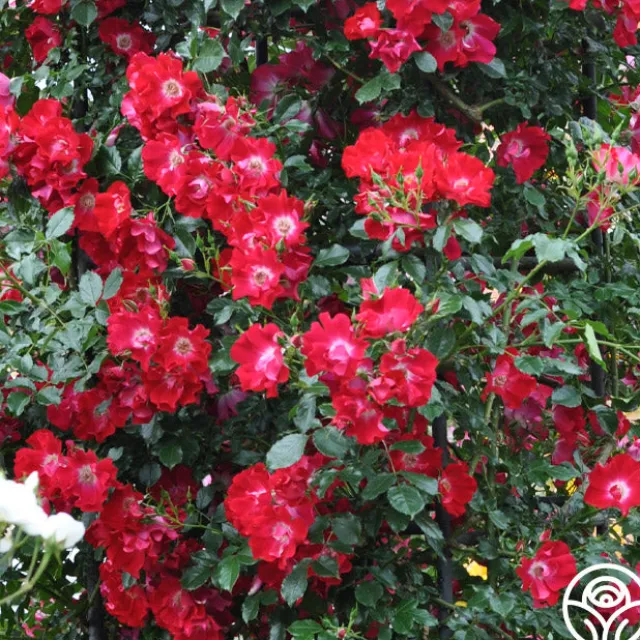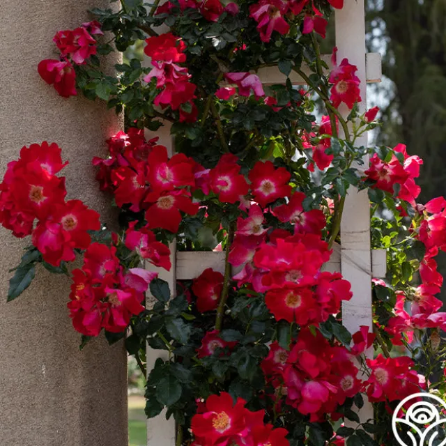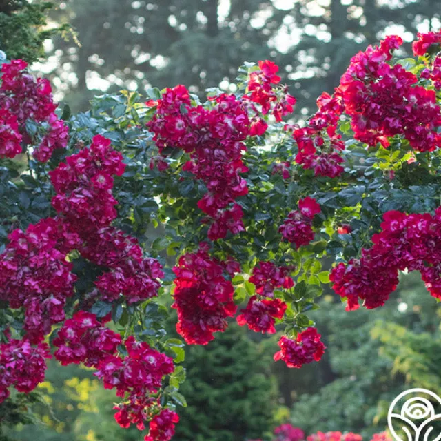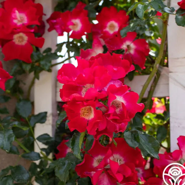 Dortmund® is a bright red rose with a white eye and ruffled, 3 1/2″ blooms on a repeat blooming Climber with extra dark, holly-like foliage. This rose will reach up to 12’ tall as her clustered blooms reach for sunlight. Dortmund®’s flowers are followed by attractive, orange hips making her a beauty in multiple seasons.
