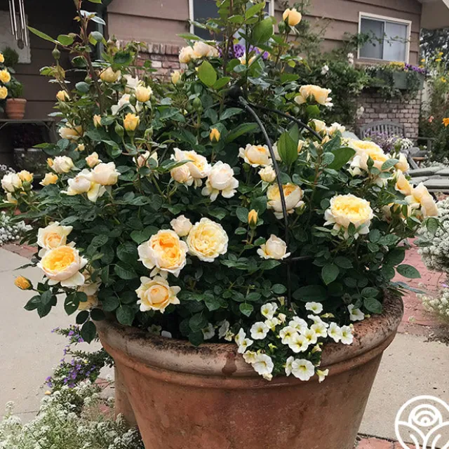Edith’s Darling™, inspired by Downton Abbey, is a beautiful tribute to the fictional Lady Edith and her daughter Marigold. The full, old-fashioned soft apricot-gold blooms have 50-60 petals and are captivating in appearance. Edith’s Darling™ has a short, compact & bushy habit, perfect for landscape beds and containers. You’ll fall in love with her strong perfume of fresh cut apples and fruity scent.