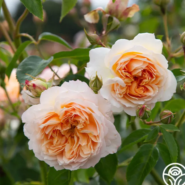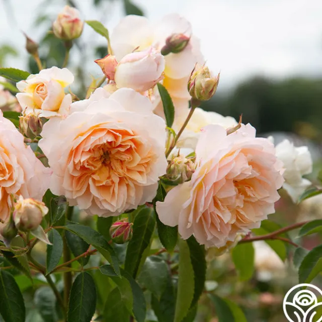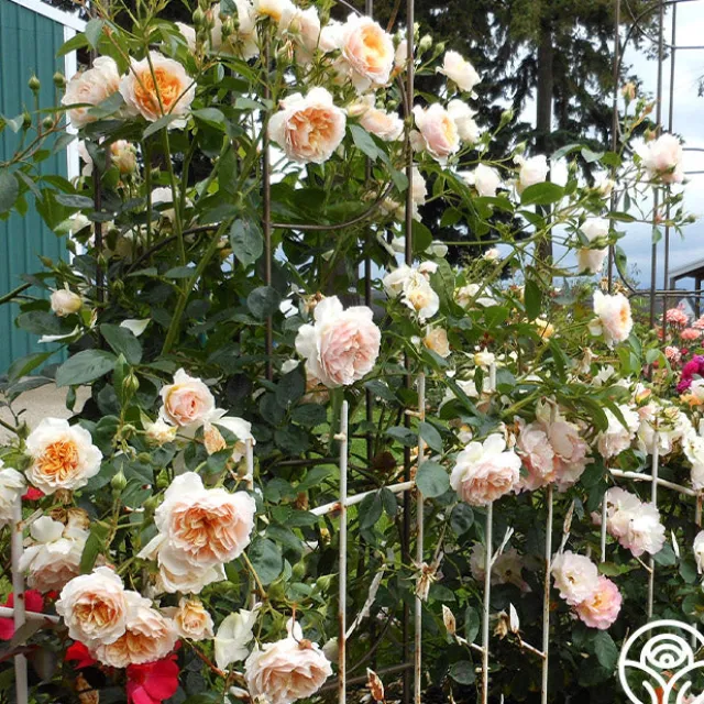 Ginger Syllabub™ is a vigorous, continual blooming Climber with amber to apricot colored 4” blooms with 70+ petals that exude an exquisite perfume. Her fully double, romantic blooms fade to the edges and are ever-so-gently ruffled. She thrives in zones 5-10.