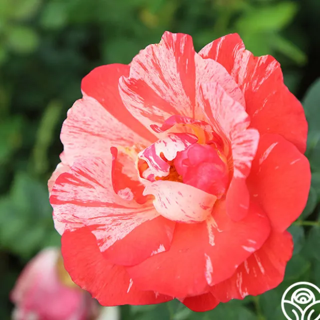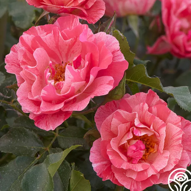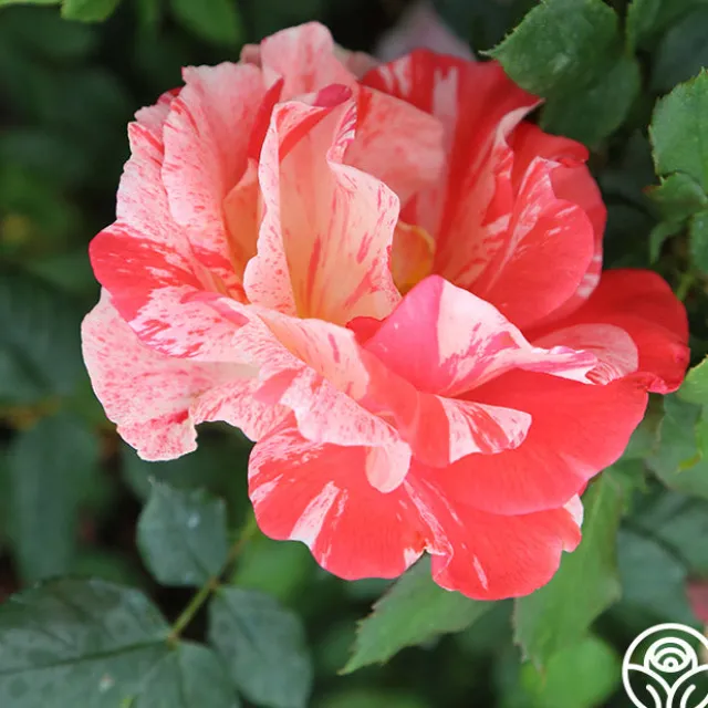 Grimaldi® is a regal, Floribunda named for Prince Rainier of Monaco. He is a strong and prolific bloomer with sweet petals of salmon-pink, splashed with cream in a ruffled yet full form. Lightly fragrant, this robust and highly disease-resistant rose, is a magnificent sight when planted in groups or as a hedge.