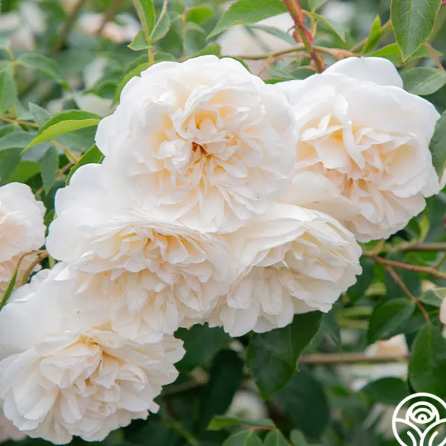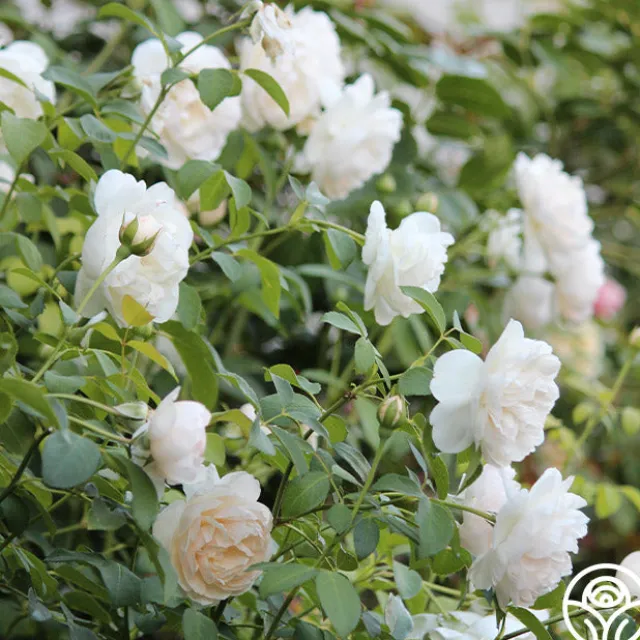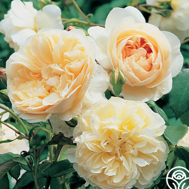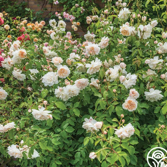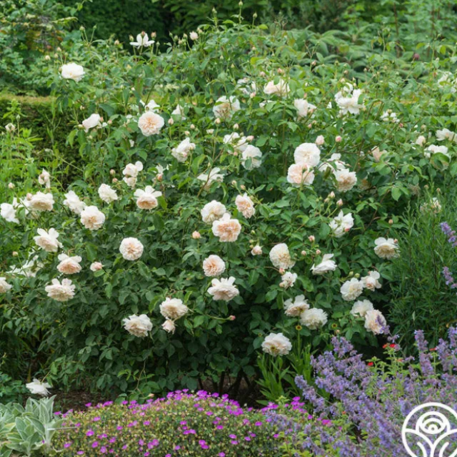 A top seller and much loved David Austin rose! The charming, peach pink cups of Lichfield Angel open to tidy, creamy apricot rosettes that emit a light, clove fragrance. With up to 110 petals on each bloom, this continually blooming rose provides large, 4”, domed, creamy-white flowers that pop against her semi-glossy, dark green foliage. Lichfield Angel is a shapely shrub, growing to be 4’ wide and 4’ tall. We love her in a cutting garden, in pots, or as a hedge as she fills out quite nicely.