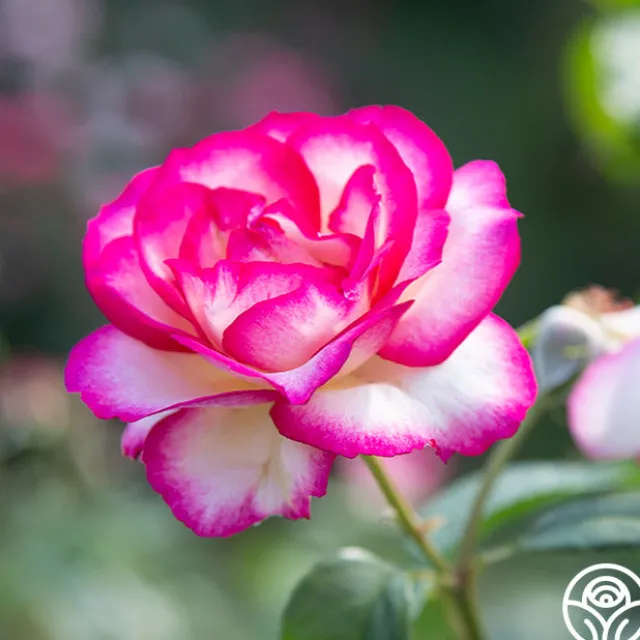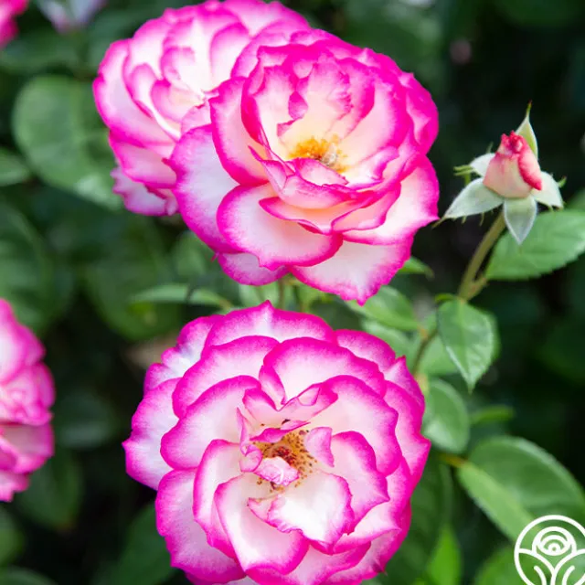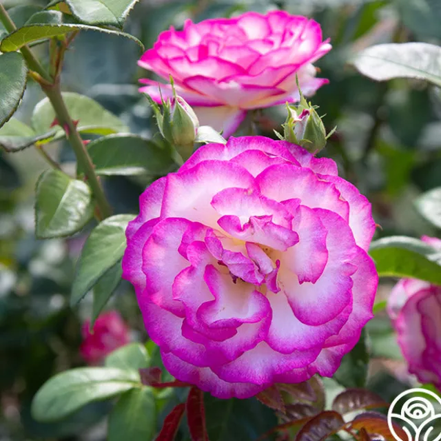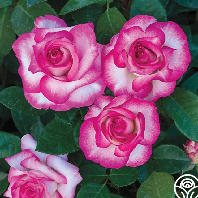 Born in flushes throughout the season, this crown-worthy beauty is definitely one of the most charismatic roses in the garden. Photo-ready blossoms of pure white are kissed with vivid pink at the edges and feature large, glossy leaves and a moderate fragrance. It’s no wonder she’s a garden star!
