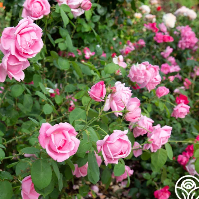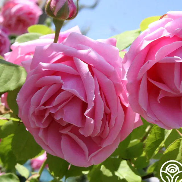 Mme Caroline Testout has grown in many gardens worldwide since her first introduction in 1894. Her buds are large and globular with bright pink petals and a darker center. David Austin used this rose to create “Wife of Bath”. The fragrance is moderate on this repeat bloomer, and her sturdy canes proudly display her large, solitary blooms and grand foliage.