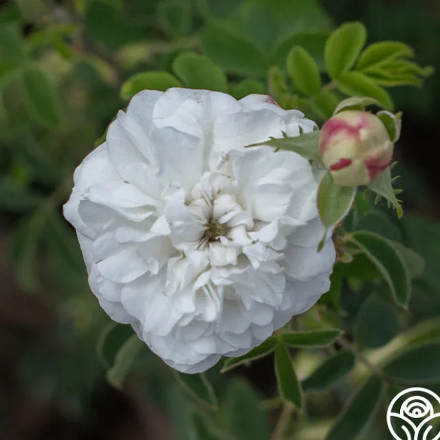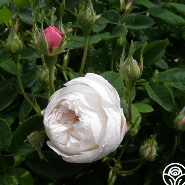 This variety is a hybrid alba (crosse with a noisette). An outstandingly fragrant, fully double, medium size pompon blooms of rich, creamy white. Borne in great profusion early in the season. A large graceful arching bush that may be trained as a climber. Not for the small garden but wonderful if you have the room. Once blooming.