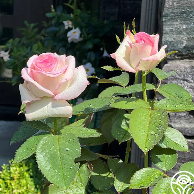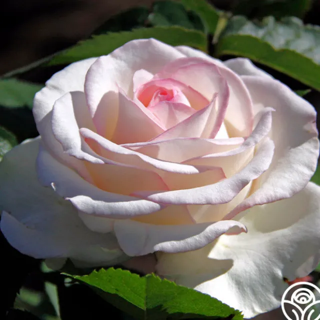 Like moonstone gems that produce a milky, blush pink, iridescent shimmer, our Moonstone™ produces huge, 6″ blooms of a soft cream that are finely edged in delicate pink. The blooms have a petal count of 30+ and emit a mild, nutty rose fragrance, making it a wonderful cut flower. This continual bloomer is a “must-have” for gardens in drier climates as she doesn’t care for too much moisture.