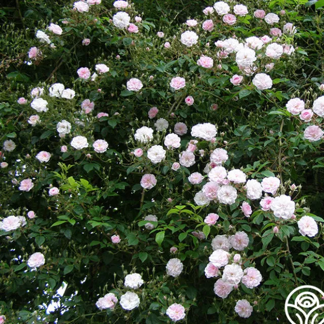 One of the most beautiful of all Rambling roses. Fully double, rosette-shaped blooms of lovely, soft, blush-pink, borne in graceful swaying pendulous sprays, with each 1″ + bloom (petals 40+) standing out as an individual. There is one growing in a Chestnut tree in the garden, and always gets a lot of attention when it is in bloom. Once blooming.