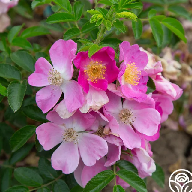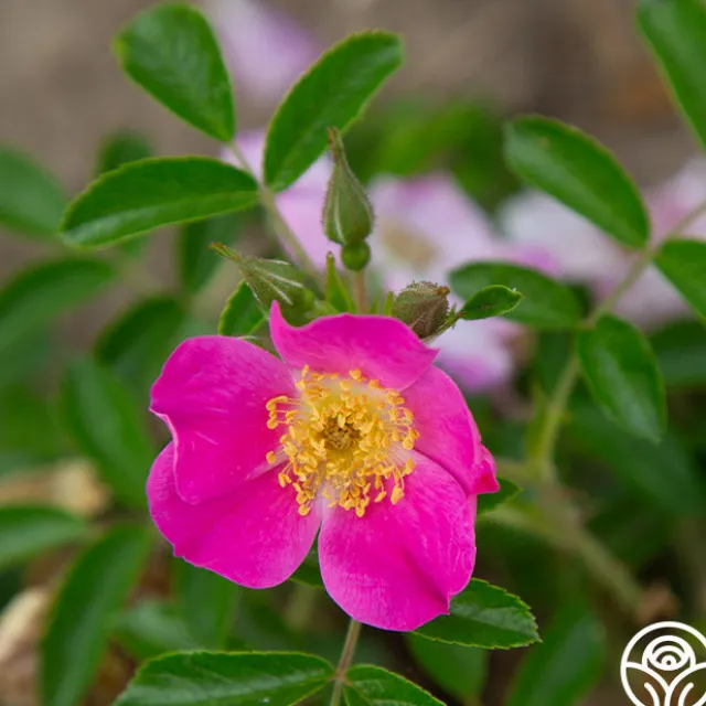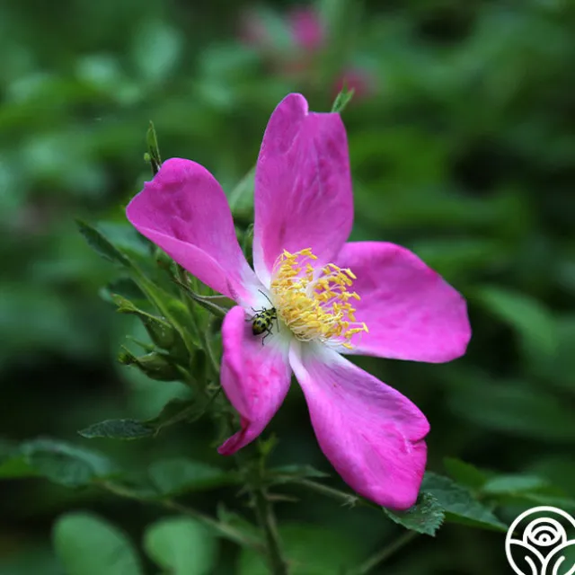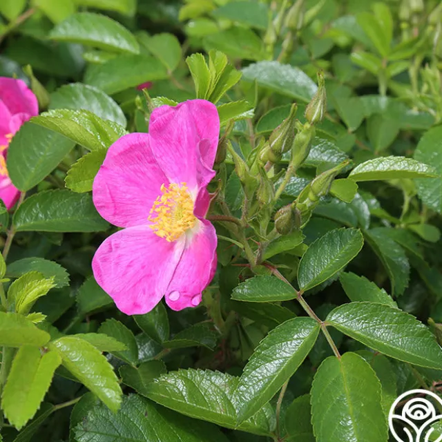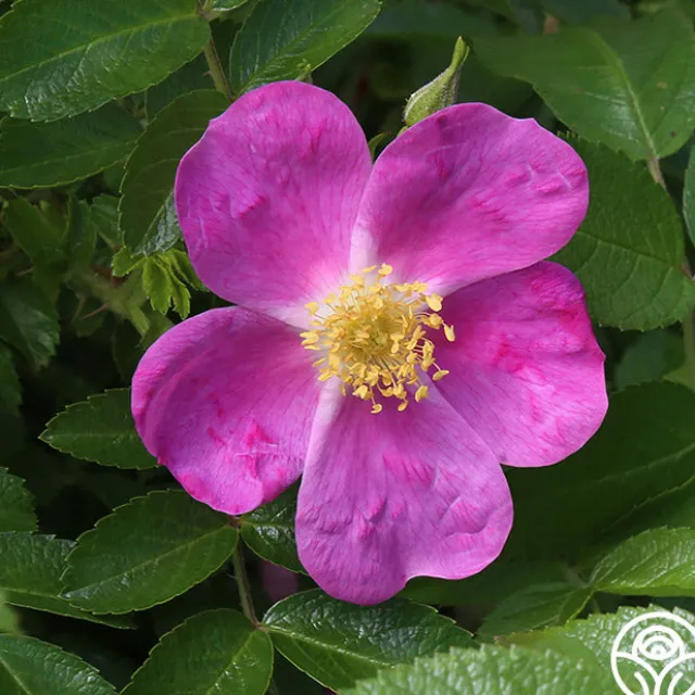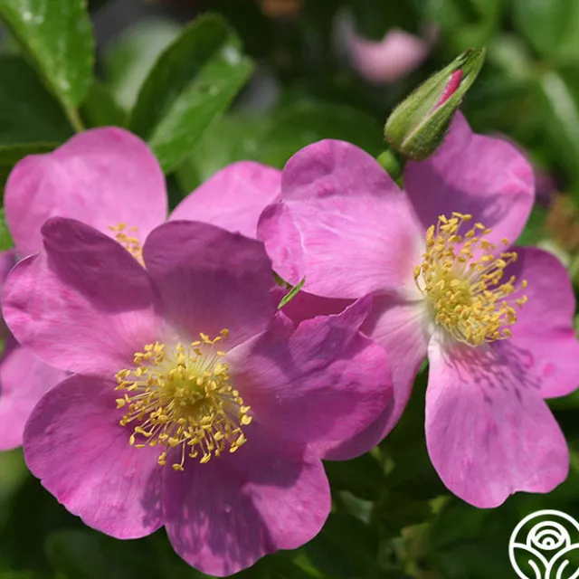 A lovely Rugosa, Rosalina blooms generously with clusters of little, bright pink, single blossoms on rich green foliage, growing to a size of 3’ x 3′. In the fall, she produces beautiful, bright red hips. A rare find, but she is deer resistant! This continual bloomer will perform well in zones 3 and up.