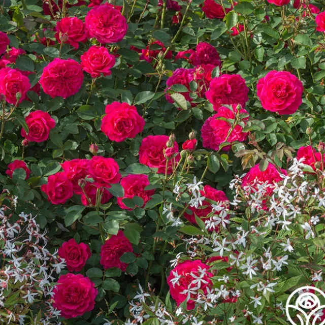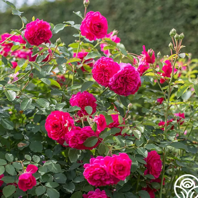 This rose starts with small buds that open to full-petalled flowers with a bright, deep pink color that intensifies with age. As a lightly fragrant and continually blooming rose, the rosettes also become more dome-shaped over time. The flowers are 2 1/2–3 inches in diameter on average and produce very freely on a healthy, very bushy, slightly arching, medium-sized shrub. The plant grows to be 4’ tall and 3’ wide.