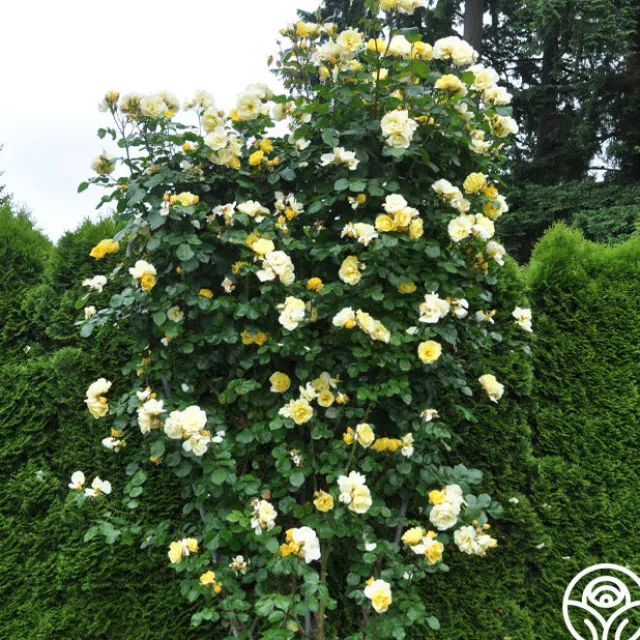 Sky’s The Limit™ is a delightfully sunny, medium-sized rose with butter yellow, 5″ blossoms of 17-25 ruffled petals. Expect her clusters to be abundant and quickly re-bloom making this Climber a good choice for a trellis, fence, or wall that needs a splash of bright color.