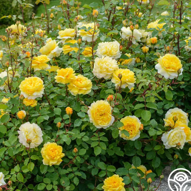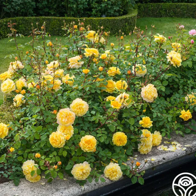 STRONG FRAGRANCE! The Poet’s Wife is a fantastic rose with flowers of intense yellow. She has a beautifully cupped form with a neat outer ring of petals enclosing an informal group of petals within that exude a rich, lemon fragrance that becomes stronger with age. The Poet’s Wife forms a naturally arching shrub that is perfect for use in a traditional rose border or for blending with other plants in a mixed border. We recommend her also for cutting gardens and pots. Expect her to grow to about 4’ by 4’.