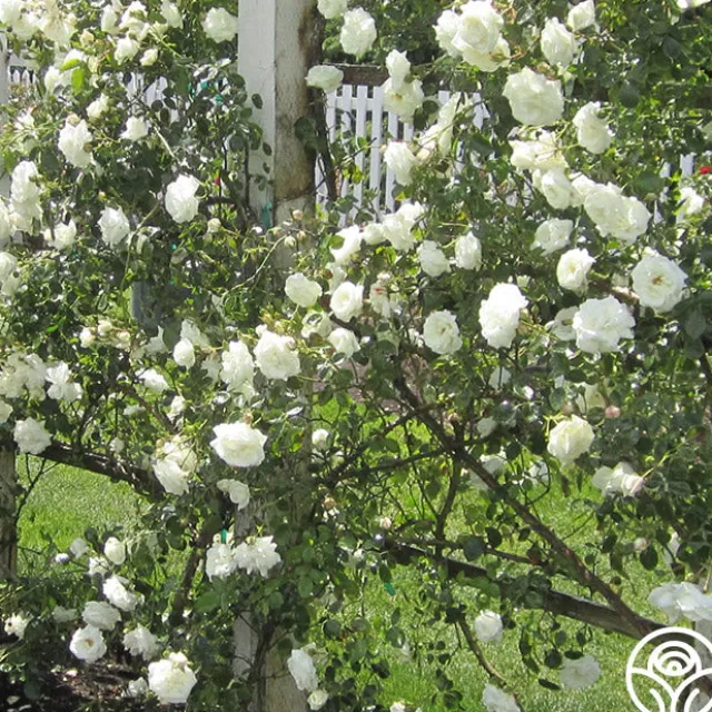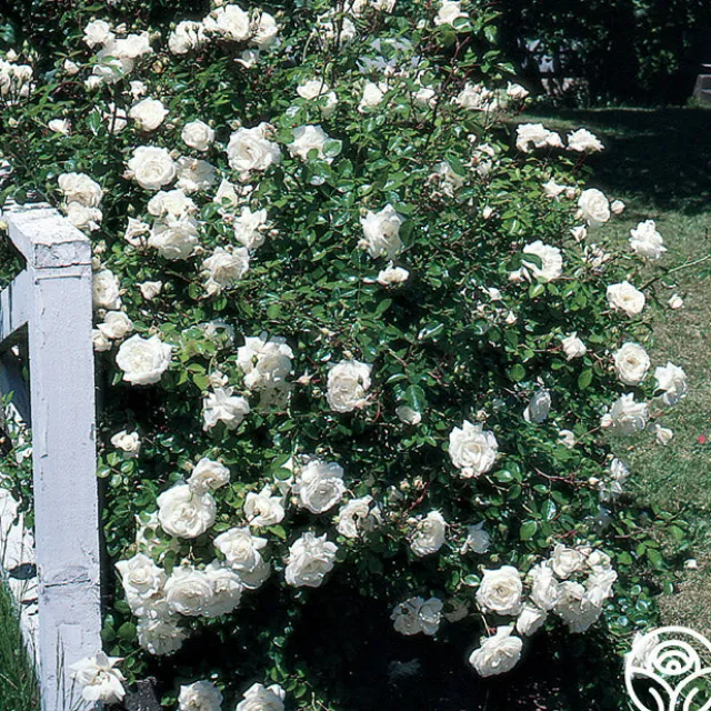 White Dawn® features fully double, ivory white blossoms with golden centers borne continuously and in abundance. Everyone falls in love with her gardenia-like form and long-lasting dark foliage that is nearly evergreen. White Dawn® is a strong Climber that will reach heights up to 15’ tall and a width of 6’. This repeat bloomer thrives best in Zones 6-10.