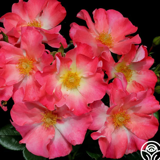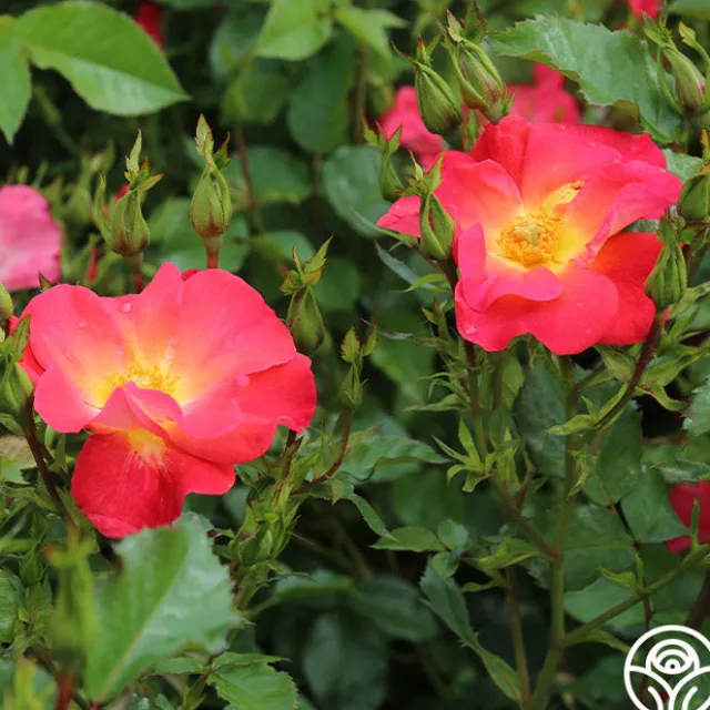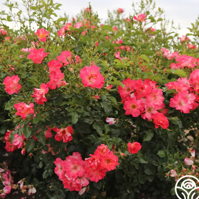 This cleverly named rose is a compact yet vigorous plant with large clusters of flowers that nearly cover any sign of her bright green leaves. Yabba Dabba Doo produces hundreds of very bright, pointy buds that open into huge hydrangea-like heads of warm orange pink with ‘eyes’ of yellow. She is pollinator friendly and does best in zones 7-10.